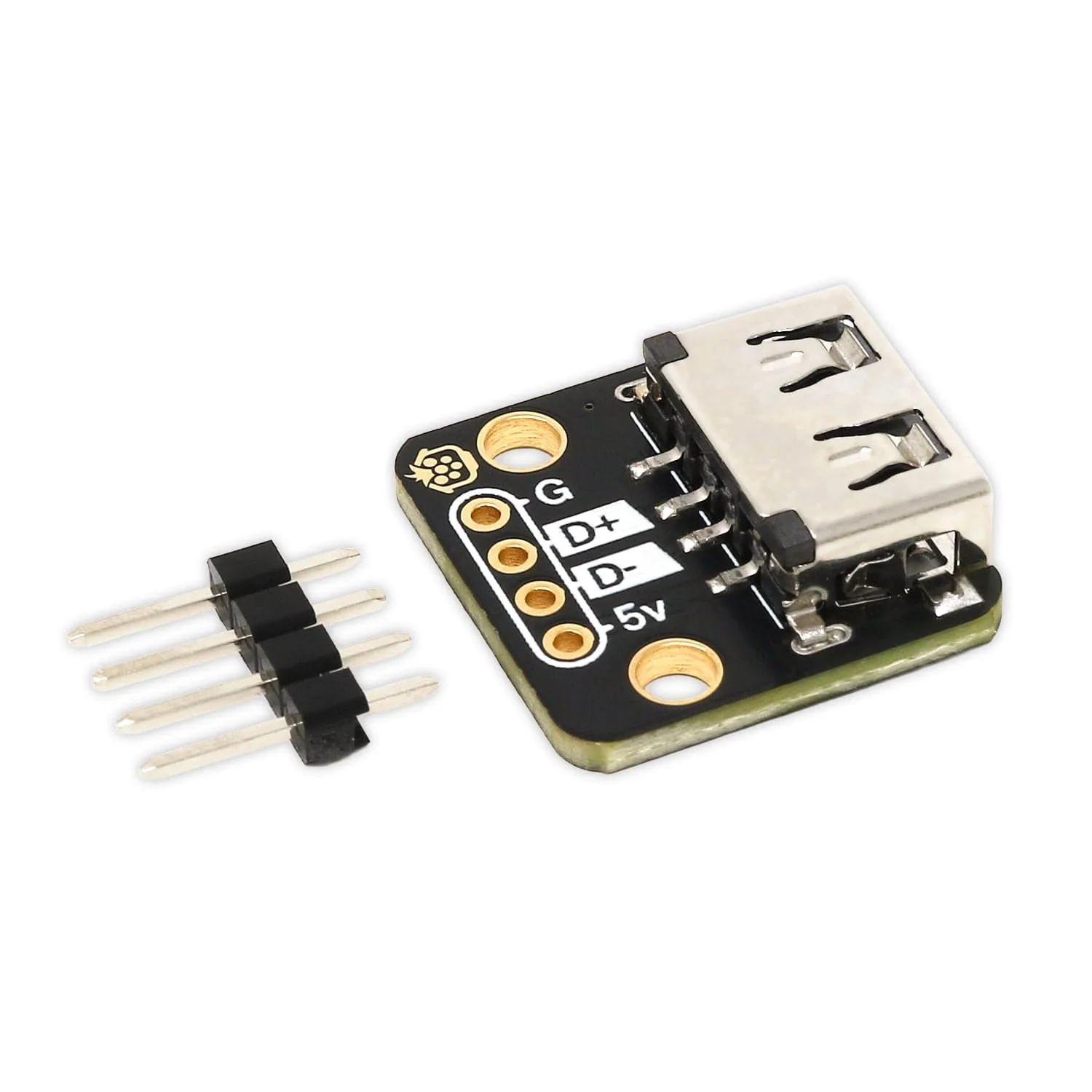Each pin from the USB-A connector is broken out to clearly labelled 2.54mm-spaced pads. You can solder whatever you like to these, such as the included 4-pin 2.54mm header strip (great for breadboard usage), some prototyping wire, or even a 4-way 2.54mm terminal block.